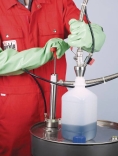 Pompe a pistone, gas-tight, in acciaioPompa a pistone per fusti a tenuta di gas con tubo flessibile di scarico per il riempimento di taniche da contenitori di grandi dimensioni. Comodo travaso perché il fusto può rimanere sul pavimento. Durante il travaso con normali pompe non è possibile evitare la fuoriuscita di vapori nell'atmosfera. Questo sistema del doppio tubo evita questo. Gli eventuali vapori prodotti ritornano dal contenitore che deve essere riempito al contenitore originale tramite il secondo tubo. Entrambi i tubi sono dotati di rubinetti. Le pompe a tenuta di gas vengono utilizzate per sostanze che hanno un forte odore come l'ammoniaca. Parti a contatto con il fluido: Acciaio inox AISI 304 (1.4301), PTFE, ottone nichelato, PA che può condurre elettricità.Sono inclusi raccordi a vite a tenuta di gas con filettatura fine da 2". Per aperture di bottiglie da 16-49 mm. Tubo ad immersione Ø 32 mm. Non idonea per acetone Durante il prelievo liquidi infiammabili, il tubo e la pompa devono essere collegate a terra! Il set antistatico Bürkle, fornito separatamente, può essere utilizzato per mettere a terra il sistema durante il travaso di liquidi infiammabili, in modo che non si formino cariche elettrostatiche. | |||||||||||||||||||