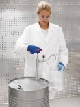 Pompe a pistone, in acciaio, con tuboPompe a pistone in acciaio inox AISI 304 (1.4301), idonea per il travaso di liquidi combustibili e facilmente infiammabili. La pompa in acciaio può condurre elettricità e per soddisfare i requisiti per la manipolazione di liquidi infiammabili, deve essere utilizzata in combinazione con il set antistatico, venduto separatamente. Le guarnizioni in PTFE garantiscono un uso a lungo termine e senza manutenzione. Capacità di pompaggio ca. 9-22 l/min, a seconda della lunghezza della pompa. Tubo di immersione Ø 32 mm. L'ampia gamma di accessori permette di adattare la pompa a esigenze molto diverse. Non adatto per acetone! Modello con tubo di espulsione rigido. Modello con tubo di espulsione flessibile PTFE con treccia in acciaio, lunghezza 1,2 m e rubinetto di arresto con valvola a sfera in acciaio inox NW 8 con beccuccio di uscita diametro 12,8 mm. | ||||||||||||||||||||||||||||||||||||||||||||||||||||||||||||||||