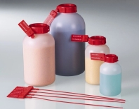 Bottiglie in PE-HD, con tappo, occhielli per sigillo SafeSealBottiglie robuste in PE-HD, con occhielli di tenuta sul tappo a vite e sulla bottiglia. Particolarmente adatto per l'invio di campioni. I sigilli forniscono la certezza dell'autenticità del campione. Facile da riempire grazie all'ampia apertura, particolarmente adatta per fluidi viscosi, polvere, granuli e paste. Sigillo di garanzia SafeSeal, da acquistare separatamente. | ||||||||||||||||||||||||||||||||||||