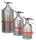 Bottiglie safety, chiusura beccuccioBottiglie di sicurezza, con beccuccio dosatore a chiusura automatica, con superficie elettrolucidata o opaca, per lo stoccaggio e la distribuzione di liquidi e sostanze chimiche infiammabili. In acciaio inox 1.4571 di alta qualità (spessore mm 0,6), tappo con guarnizione in PTFE ad elevata resistenza chimica e anello di protezione in plastica sul corpo della bottiglia. Impugnatura in alluminio verniciato a polvere, modello non lucidato (01DU) in acciaio inossidabile, forma ergonomica per una presa sicura. Rompifiamma per la protezione dalle fiamme libere ed esplosioni. Valvola di regolazione della pressione (sfiato da circa 0,3 bar). | ||||||||||||||||||||||||||||||||||||||||||||||||||||||||||||||||