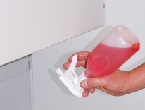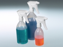 Bottiglie spruzzatore spray, in PE-HD, capovoltaBottiglia spray, spruzzo in continuo, anche capovolta. Parti a contatto con fluidi in PP, PE, silicone e acciaio inossidabile. Diametro ugello 0,6 mm, ugello regolabile in altezza. Quantità spruzzata per corsa: 1,2 ml ± 0,1. Con le spruzzette normali, appena il tubo di aspirazione, non è immerso nel liquido, non è più possibile spruzzare. Questo modello di spruzzatore, consente di operare da qualsiasi posizione in modo pratico e raggiungere punti di difficile accesso, senza affaticarsi. | |||||||||||||||||||||||||||||