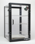 Essiccatori Dry-Keeper, in PVC- ABS, verticaleArmadio essiccatore Dry-Keeper verticale in PVC trasparente. Ha dei profili verticali ABS nero e ripiani mobili per regolare la configurazione dello spazio di stoccaggio dei materiali sensibili all'umidità. 3 ripiani regolabili, rimovibili e forati facilitano la piena circolazione dell'aria, le guide del ripiano possono essere riposizionate su uno qualsiasi dei 15 gradini impostati a intervalli di mm 28, guide e ripiani devono essere acquistati separatamente. Ampio igrometro digitale da interno per una facile visualizzazione dell'umidità relativa. La porta con guarnizione si apre a destra e si chiude con due chiavistelli per una tenuta ermetica, l'apertura interna misura mm 250x430. Fornito con vassoio per essiccante. | |||||||||||