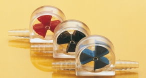 Indicatori di flusso, CheMobilCheMobil è un indicatore di flusso in SAN, permette di regolare la portata dell'acqua di raffreddamento, poichè fornisce un'indicazione visiva precisa della velocità del flusso di liquidi o gas trasportati attraverso i raccordi dei tubi flessibi. L'indicatore di flusso con girante funziona in entrambe le direzioni e in qualsiasi posizione. L'elica in PP inizia a ruotare ad una portata di circa 150 ml/min. Disponibile in diversi colori. Temperatura max +60°C. | |||||||||||||||||||||||||