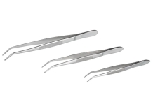 Pinzette in acciaio inox , punte curve piegate a squadra, dentellatura interna.
