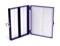 Scatole portavetrini in PC, posti 25-100, bassa temp °CScatola portavetrini in PC per conservare a temperature basse fino a -80°C. Chiusura in policarbonato e acciaio inossidabile. Fessure scanalate uniformi per vetrini da mm 25x75. Impilabili. | ||||||||||||||||||||||
