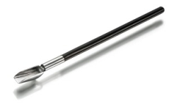 Spatola con manico in plastica e paletta curva in ottone nichelato.