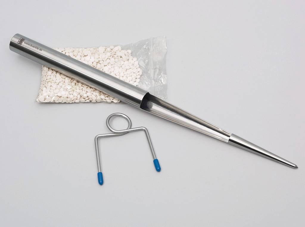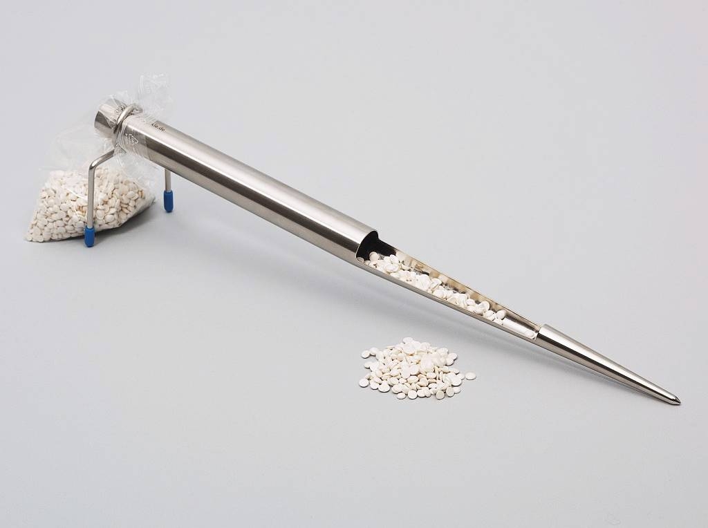 Stickproof, campionatore a puntaStickProof è un campionatore per polveri, realizzato in acciaio inossidabile AISI 316L, materiale 1.4404. La punta particolarmente sottile può essere inserita facilmente e profondamente per prelevare il campione, la forma conica consente la raccolta di quantità molto piccole o maggiori. StickProof è costruito in un unico pezzo senza spigoli, scanalature o fessure per una perfetta e facile pulizia. Il campione prelevato viene raccolto direttamente nel sacchetto fissato con il morsetto sull'estremità di uscita del tubo. Fornito completo di morsetto e 100 sacchetti in PE da mm 20x170. | |||||||||||||||||||||||||||||