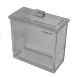 Vasca cromatografica sumultan, con scanalature, coperchio a pomoThis chamber is commonly used for washing TLC plates before use and then for storing them in protected manner. This procedure is used in particular for quantitative trace analysis. The vertical grooves in the transverse walls will hold up to five plates of 200 x 200 mm. Specific features of this separating chamber are the plain ground flange edge and the flat chamber floor. The lid can be used as cover during prewashing. | |||||||||||||