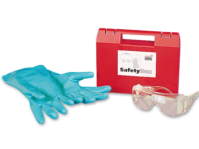 Valigetta pronto soccorso completa di occhiali e guanti nitrile per la sicurezza personale.