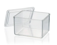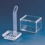 Vaschetta in PMP per colorazione vetrini da usare in combinazione con il cestello con manico per colorazione vetrini (codice 474305). La vaschetta viene fornita con due coperchi, uno copletamente chiuso, onde evitare l'evaporazione del liquido quando la vaschetta non viene usata; uno con una ristretta fessura, per l'inserimento del cestello durante le colorazioni., ma sufficientmente chiusa. Il cestello con manico in PP può contenere 10 vetrini.